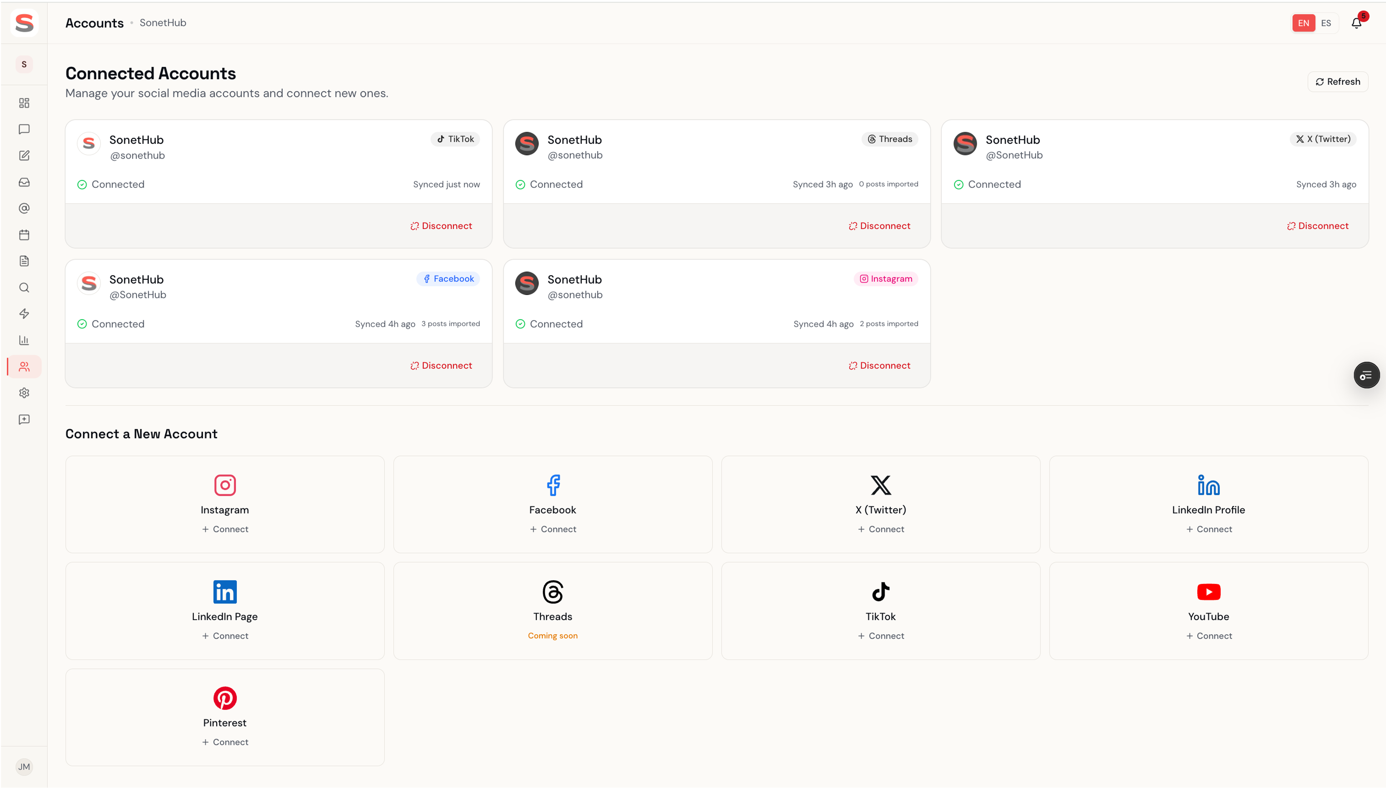 - Enterprise features. Complex approval chains, compliance workflows, multi-org management — Hootsuite has 16 years of enterprise tooling. SonetHub isn't built for 500-person marketing departments.