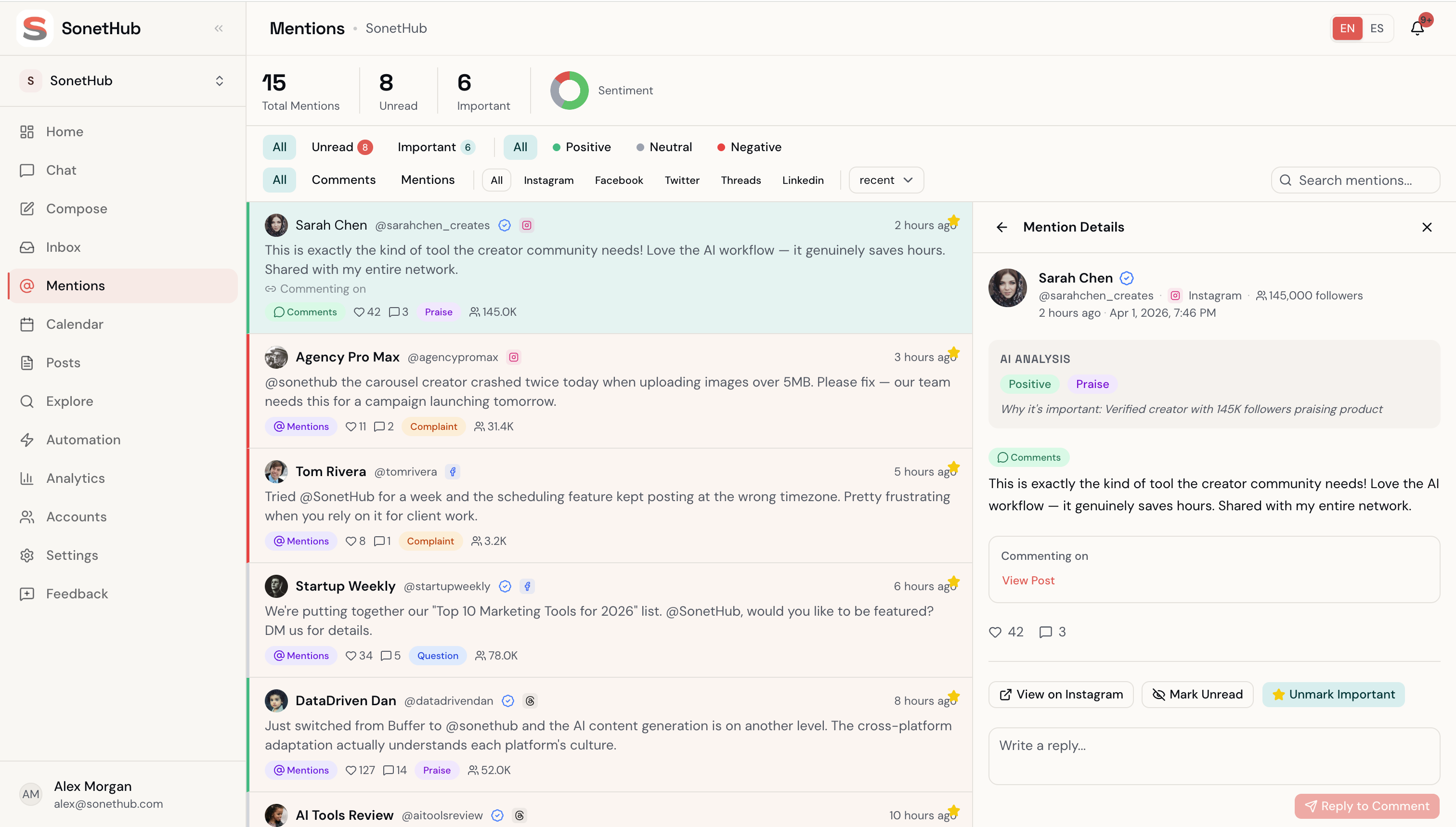 - Social listening at scale. Sprout is ranked #1 in G2's 2026 Spring Reports for social listening. Their Trellis AI agent turns listening data into actionable intelligence. SonetHub monitors brand mentions across your connected platforms (Instagram, Facebook, Threads, TikTok Business) with AI sentiment classification — but it can't track arbitrary keywords across the entire web or monitor competitor conversations the way Sprout's dedicated listening engine can.