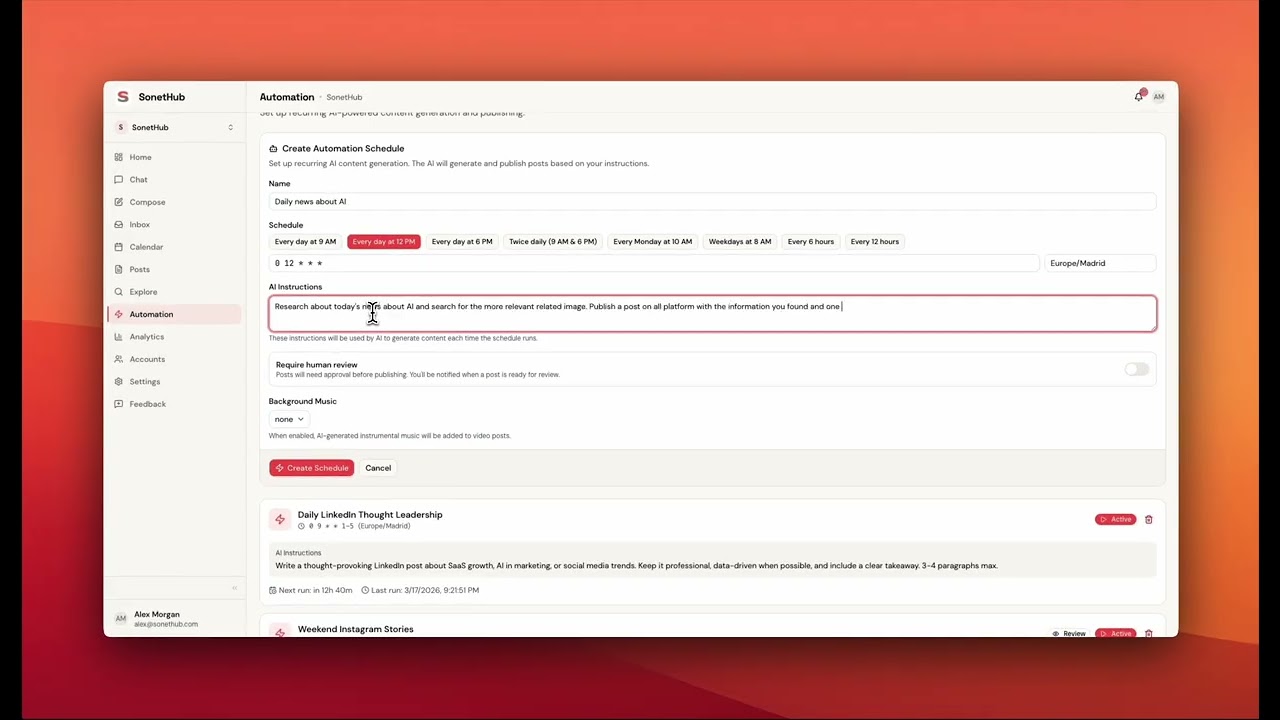 Establece horarios de publicación o deja que la IA elija. Crea automatizaciones recurrentes — la IA genera contenido fresco, tú apruebas con un clic.